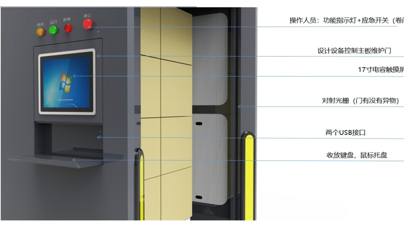 22工控觸摸顯示屏,配備可收放鍵盤,方便實(shí)時(shí)交互輸入操作。工控顯示屏鑰匙開啟后可上掀,方便維護(hù)。